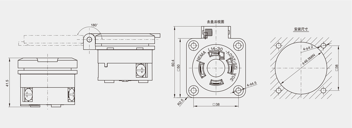 American socket L14-30R with cover Category:American Series > Industrial plug and socket 13868759177 / 13868895688 / 13736999786 13868759177@163.com Contact Us Technical Parameter 1.Rated: 125VAC 30A; 125/250VAC 30A; 125VAC 20A; 2.Contact resistance: ≤0.5Ω; 3.Insulation resistance: ≥100MΩ; 4.Withstand voltage: 2000VAC/min; 5.Insertion and extraction force: ≤15-93Nf; 6.Electric life: 5000 times;